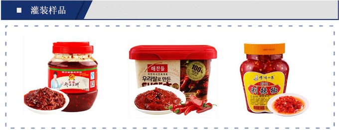 醬料灌裝生產線主要用於灌(guàn)裝含顆粒的半流體、膏體、豆豉醬料(liào)物料的灌(guàn)裝如辣椒醬、豆豉醬、火鍋料、牛肉(ròu)醬、香菇醬、郫縣紅油豆瓣醬等
