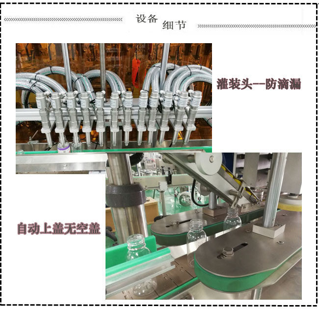 2、采(cǎi)用防高泡產品的灌裝升降係統、雙重防滴漏與拉絲(sī)的灌裝悶頭(tóu)、確保瓶口定位的液位(wèi)控(kòng)製和定位係(xì)統。
