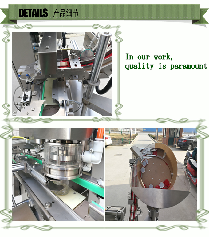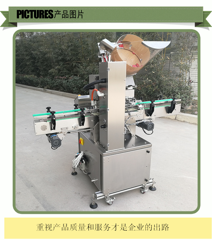 自動真空旋蓋機機是我司多名具有豐富經驗的(de)高(gāo)級工程師(shī)研(yán)發,集自動(dòng)理蓋、上蓋、自動抽真空(kōng)旋蓋於一體,手用真空(kōng)泵抽真空的方式,可(kě)獲得很高的真空度。具有無瓶不送蓋,缺蓋自動報警功能,自動化程度高,主要氣動及電器元件采用國際知名品牌,性能穩定可靠,廣泛(fàn)適用於食品罐頭、飲料、調味品、保健品(pǐn)等行業(yè)中玻璃瓶、馬口鐵蓋的真空旋(xuán)蓋。